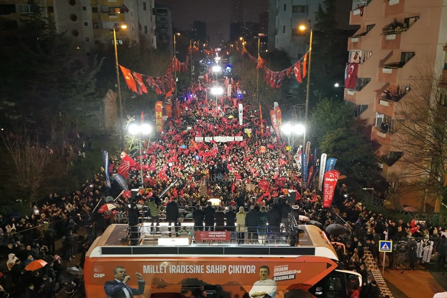 “Bugün 90’ıncı eylem ama İstanbul’da 39 ilçenin 39’uncu ilçe mitingi. Buradan Ataşehir İlçe Başkanımız Anıl Dizdaroğlu’nun şahsında, öncelikle tüm Ataşehir örgütümüze teşekkür ediyorum. Anıl Başkan ile birlikte teker teker ismini şimdi sayamayacağım 39 ilçe başkanımıza, yönetimlerine, üyelerimize ve onların organizasyonlarıyla 39 sefer bizi mahcup etmeyen tüm İstanbullulara yürekten bir dayanışma için yürekten teşekkür ediyorum. Şunu bilin ki gizli gizli bu meydanı izleyen biri var. Hani o perdenin arkasından baktığı gibi Halk TV’ye bakan, Sözcü TV’ye bakan ve bu meydana bakan biri var. Ben eğer bakıyorsa canlı yayında sesleniyorum Erdoğan’a. Bakmıyorsa İletişim Başkanı’na sesleniyorum. Bu görüntülere iyi bakın. Bu kara, bu yağmura, bu meydana iyi bakın. Bu inanmışlığa iyi bakın. Ona göre bu millete, bu milletin seçtiğine el uzatırken, dil uzatırken ayağınızı denk alın. ‘Bundan sonra ne olacak?’ diyenlere… Şunu bilin. Mücadele asla durmayacak. Bu gece 39’uncu miting ama bu hikaye burada bitmeyecek. Önce İstanbul’da üçüncü bölgede, sonra ikinci bölgede, sonra bir kez daha birinci bölgede büyük bölge mitingleriyle; ardından 18 Mart’ı 19 Mart’a bağlayan gece hep birlikte büyük zulmün yıl dönümünde meydandayız, eylemdeyiz. ‘Yine kitapları, türküleri ve bayraklarıyla geldiler. Dalga dalga aydınlık oldular. Yürüdüler karanlığın üstüne. Meydanları zapt ettiler yine. Daha gün o gün değil. Dinleyin, asla dürülmesin bayraklar. Dinleyin, duyduğunuz çakalların ulumasıdır. Safları sıklaştırın çocuklar. Bu kavga faşizme karşı, bu kavga hürriyet kavgasıdır.’ Elindeki bayrağıyla, yüreğiyle buraları dolduran ve bundan sonrası için dosta güven, olmayana kaygı verenlere; bundan sonrası için ‘Arkanda kim var?’ diye sorana, ‘Onun arkasında ben varım. Millet var’ diyenlere helal olsun.”
