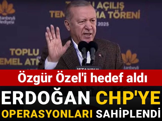 Muhalefetin siyasete yargı müdahalesi diyerek sert tepki gösterdiği belediyelere yönelik operasyonları temel atma töreninde gündemine alan Cumhurbaşkanı Erdoğan CHP’ye operasyonları sahiplendi. “CHP’nin başındaki zat belediye soyguncularına sahip çıkıyor” diyerek Özgür Özel’i hedef aldı.