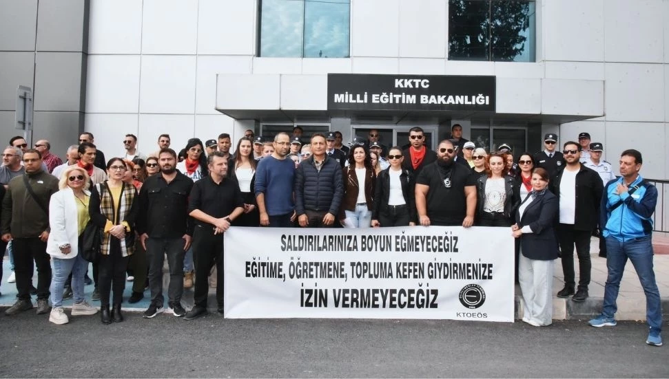 Milli Eğitim Bakanlığı tarafından hakkında soruşturma başlatılan Kıbrıs Türk Orta Eğitim Öğretmenler Sendikası’na (KTOEÖS) üye 33 öğretmen, soruşturma gerekçelerinin gerçekleri yansıtmadığı gerekçesiyle Bakanlık önünde basın açıklaması yaptı.