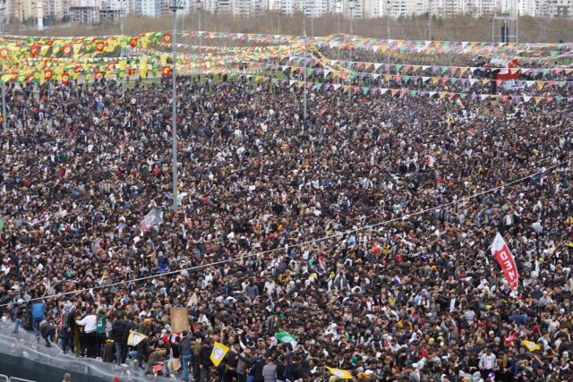 Kürt Halk Önderi Abdullah Öcalan’ın posterleri taşıyan kitle alanı doldurmaya başlarken, bazı kontrol noktalarında şal û şepik giyen yurttaşlara engel çıkarıldı. Engele “üzerinde apoletler var” gerekçe gösterildi. Yurttaşlar, engellemelere rağmen alana akmaya devam etti.